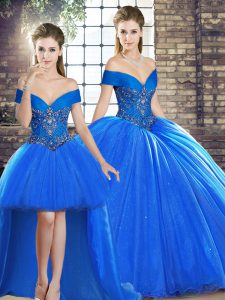 Royal Blue Quinceanera Gown Military Ball and Sweet 16 and Quinceanera with Beading Off The Shoulder Sleeveless Brush Train Lace Up