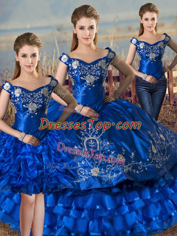 Royal Blue Satin and Organza Lace Up 15th Birthday Dress Sleeveless Floor Length Embroidery and Ruffled Layers