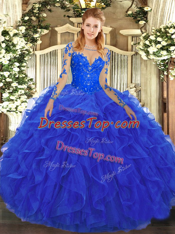 Royal Blue Scoop Neckline Lace and Ruffles Quinceanera Dress Long Sleeves Lace Up