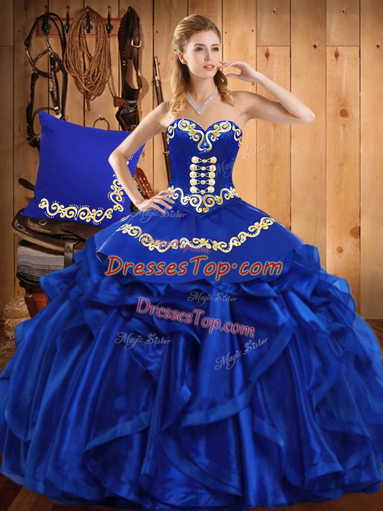 Royal Blue Sweetheart Neckline Embroidery and Ruffles Ball Gown Prom Dress Sleeveless Lace Up