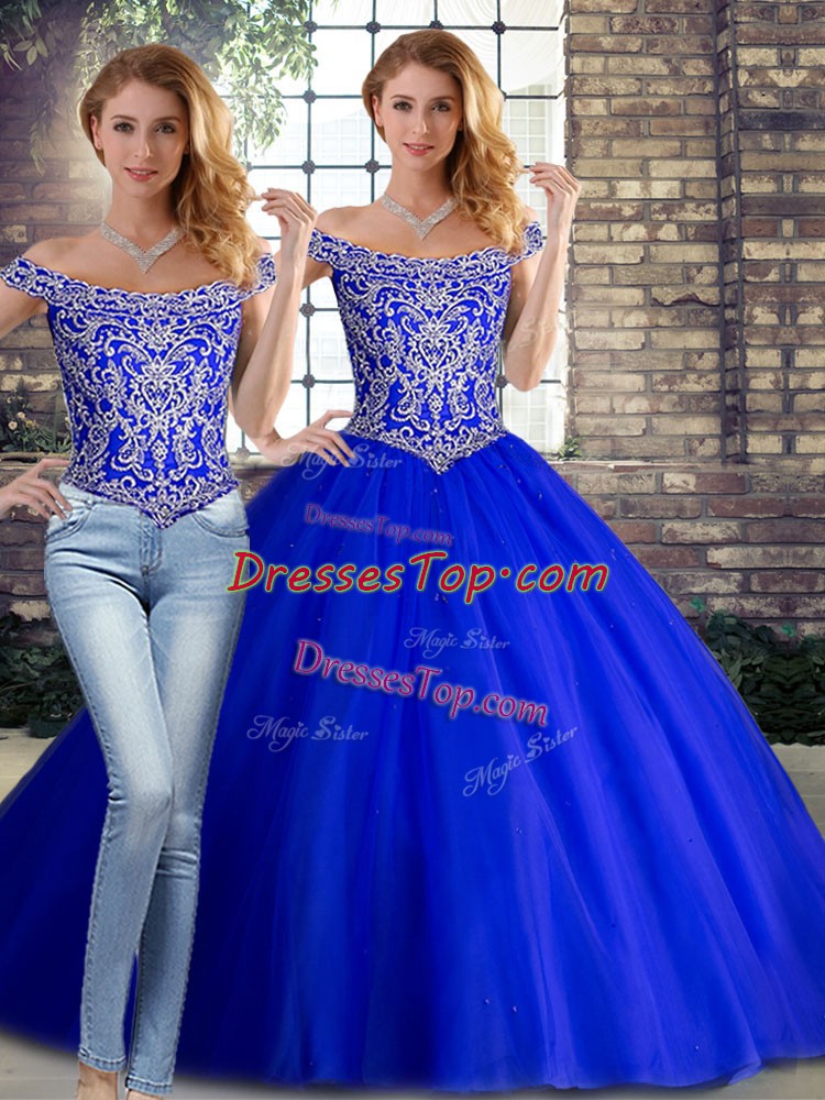 Royal Blue Two Pieces Tulle Off The Shoulder Sleeveless Beading Lace Up Quinceanera Dress Brush Train