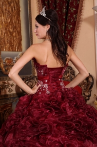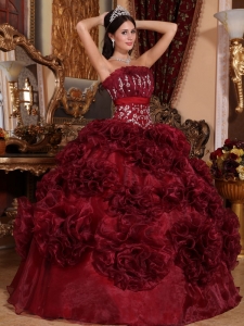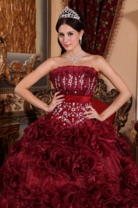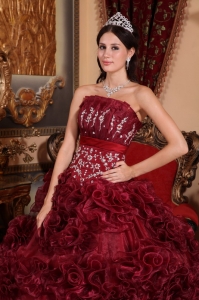 Ruffle Flowers Burgundy Quinceanera Ball Gown Appliques