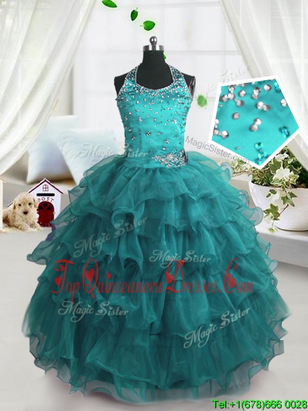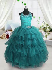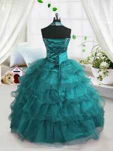 Ruffled Floor Length Turquoise Pageant Dress for Teens Spaghetti Straps Sleeveless Lace Up