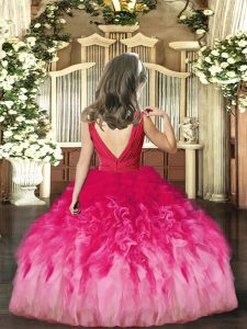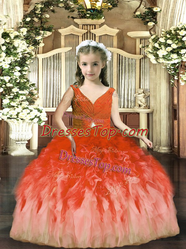 Rust Red Backless Kids Pageant Dress Beading and Ruffles Sleeveless Floor Length