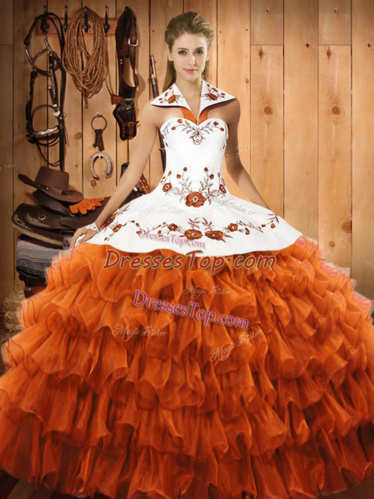 Rust Red Ball Gowns Halter Top Sleeveless Satin and Organza Floor Length Lace Up Embroidery and Ruffled Layers Sweet 16 Dress