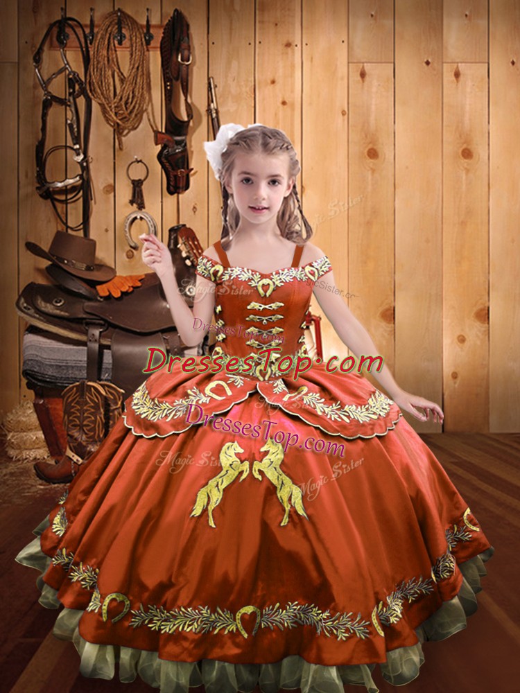 Rust Red Ball Gowns Off The Shoulder Sleeveless Satin Floor Length Lace Up Beading and Embroidery Child Pageant Dress