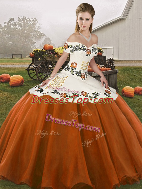 Rust Red Ball Gowns Organza Off The Shoulder Sleeveless Embroidery Floor Length Lace Up Quinceanera Dresses