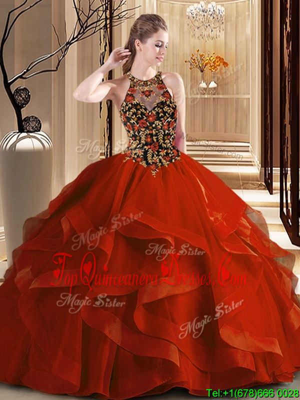 Rust Red Ball Gowns Tulle Scoop Sleeveless Embroidery and Ruffles Backless Quince Ball Gowns Brush Train