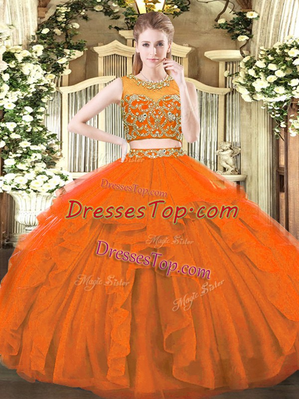 Rust Red Tulle Zipper Scoop Sleeveless Floor Length Sweet 16 Dress Beading and Ruffles