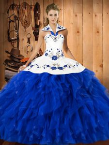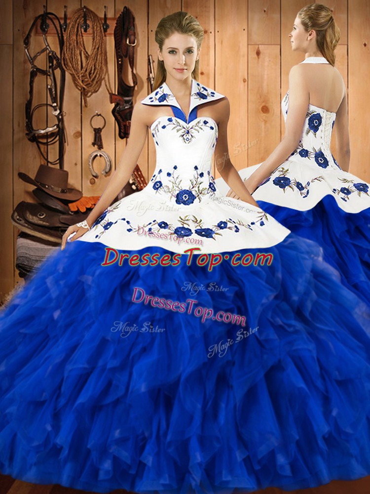 Satin and Organza Sleeveless Floor Length 15th Birthday Dress and Embroidery and Ruffles