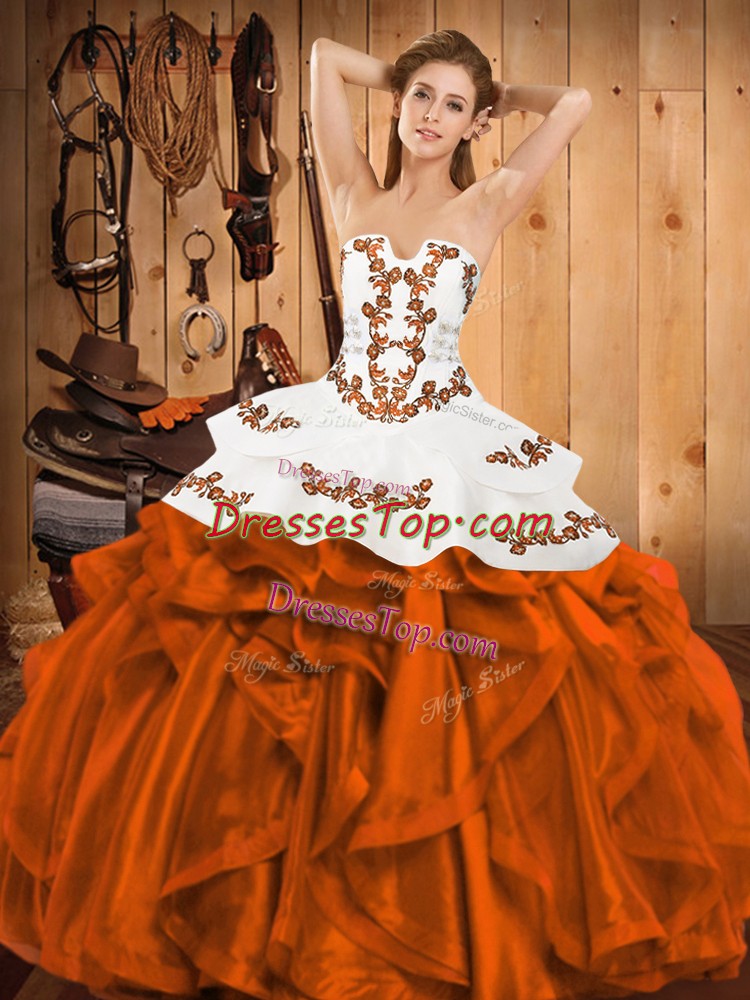 Satin and Organza Strapless Sleeveless Lace Up Embroidery and Ruffles Sweet 16 Dresses in Orange Red