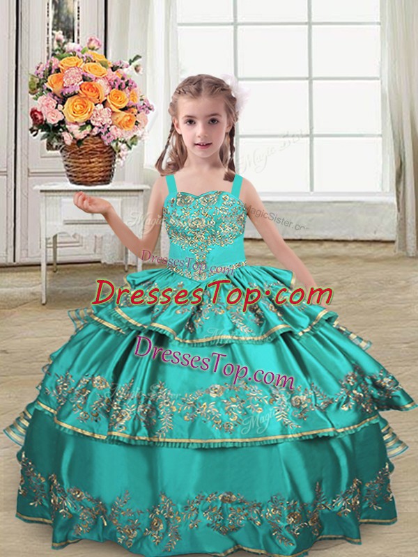 Satin Straps Sleeveless Lace Up Embroidery and Ruffled Layers Kids Pageant Dress in Turquoise
