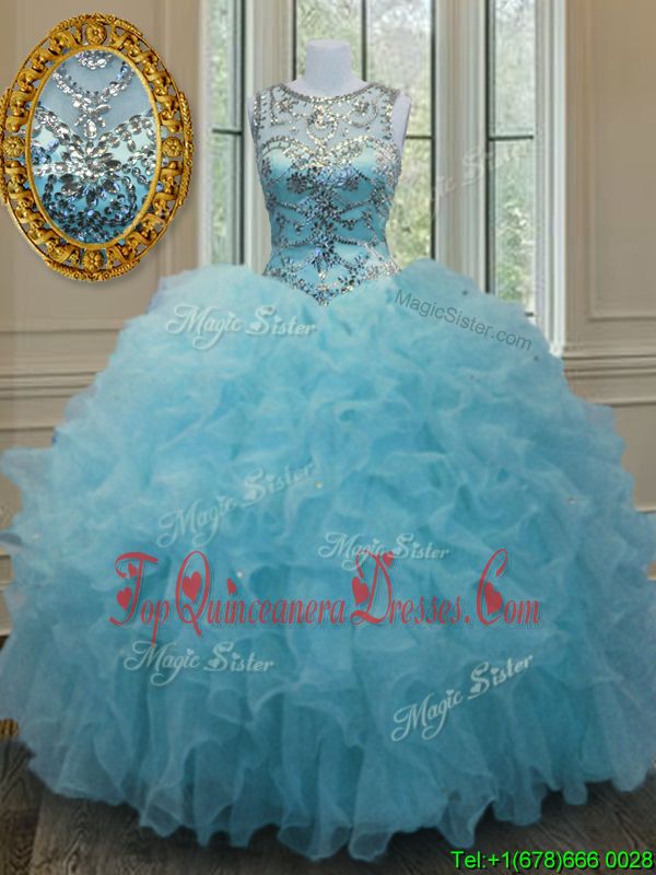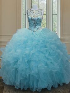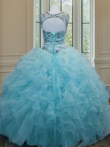 Scoop Aqua Blue Ball Gowns Beading and Ruffles 15 Quinceanera Dress Lace Up Organza Sleeveless Floor Length