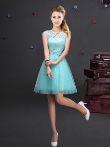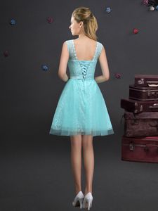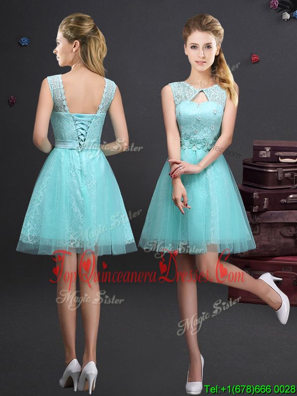 Scoop Aqua Blue Lace Up Dama Dress Lace and Appliques and Belt Sleeveless Mini Length