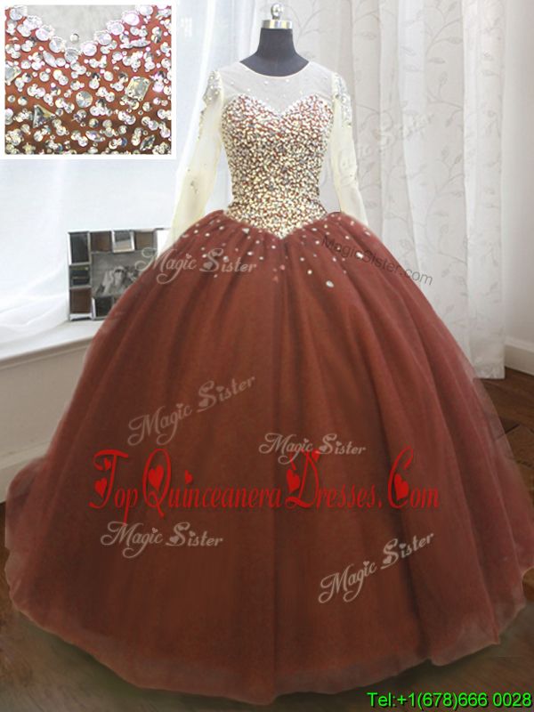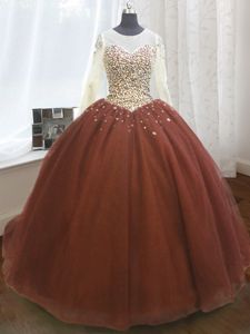 Scoop Burgundy Ball Gown Prom Dress Organza Sweep Train Long Sleeves Beading and Sequins