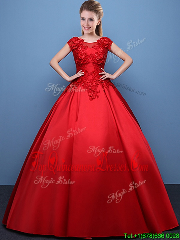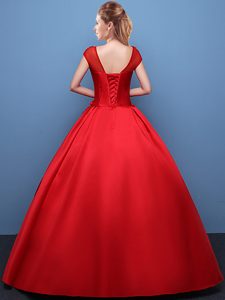 Scoop Cap Sleeves Floor Length Appliques Lace Up Ball Gown Prom Dress with Red