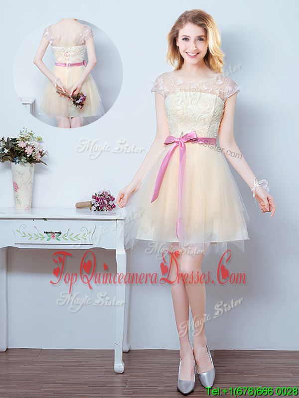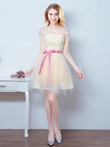 Scoop Champagne Short Sleeves Tulle Lace Up Court Dresses for Sweet 16 for Prom and Party and Wedding Party