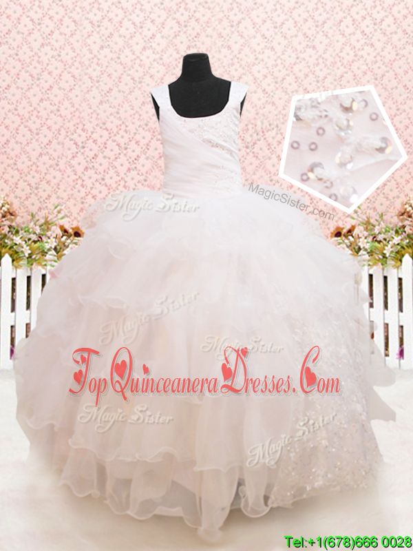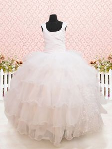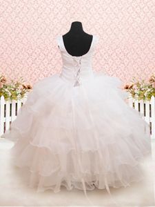 Scoop Floor Length White Pageant Dress for Girls Organza Sleeveless Beading and Ruffled Layers and Sequins