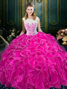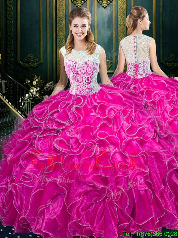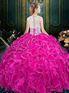 Scoop Fuchsia Ball Gowns Lace and Ruffles Quinceanera Dress Zipper Organza Sleeveless Floor Length