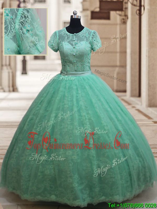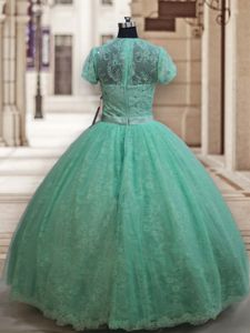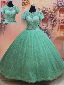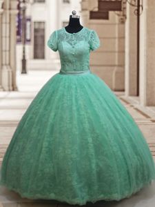 Scoop Lace Ball Gown Prom Dress Apple Green Zipper Short Sleeves Floor Length