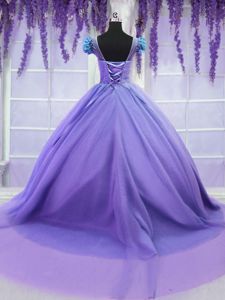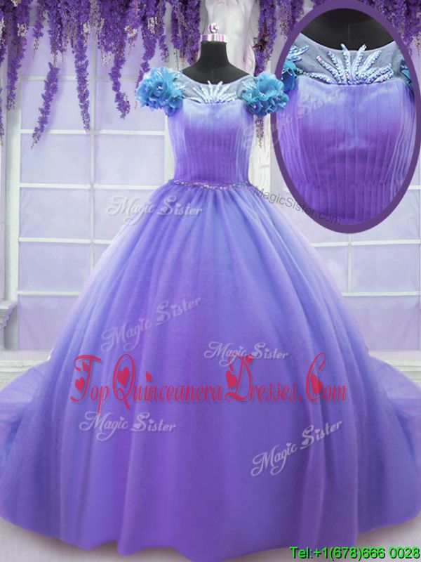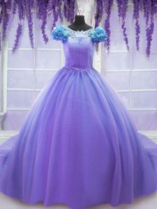 Scoop Lavender Short Sleeves Tulle Court Train Lace Up Quince Ball Gowns for Military Ball and Sweet 16 and Quinceanera