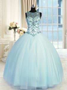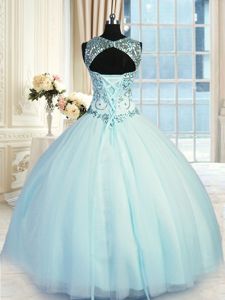Scoop Light Blue Sleeveless Floor Length Beading Lace Up Quinceanera Gown