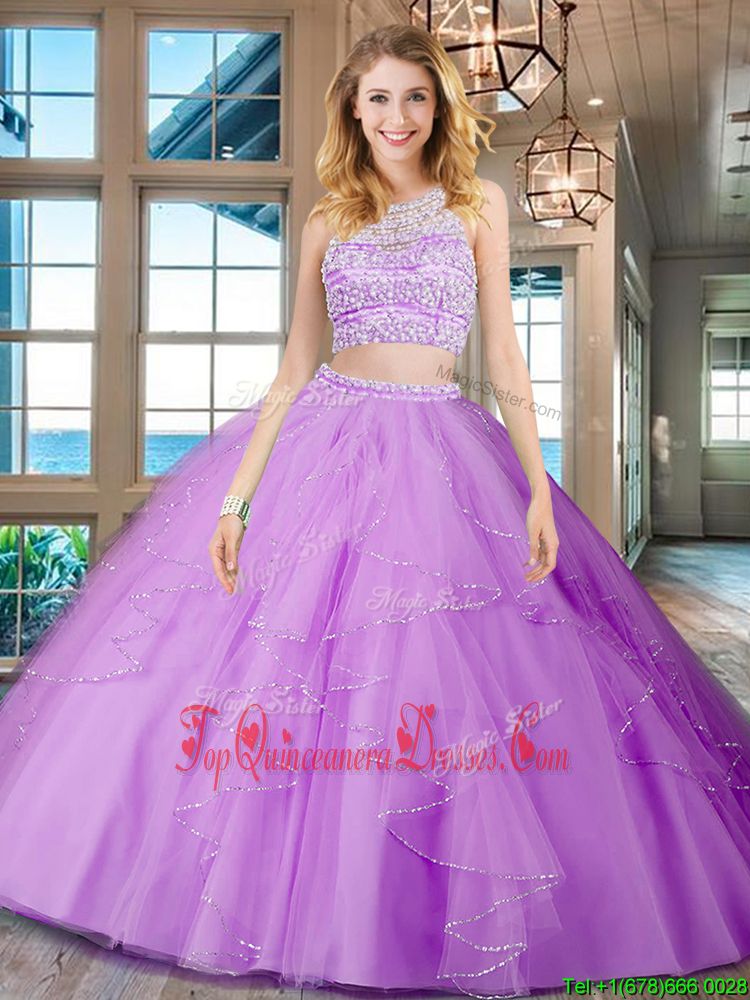 Scoop Lilac Backless Sweet 16 Dresses Beading and Ruffles Sleeveless Floor Length
