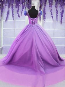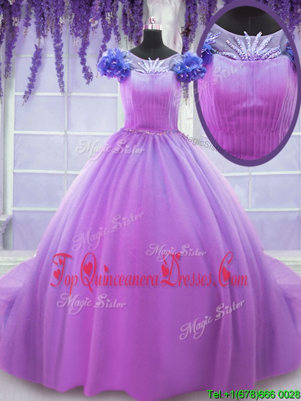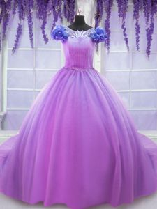 Scoop Lilac Short Sleeves Hand Made Flower Floor Length Quinceanera Gown