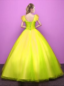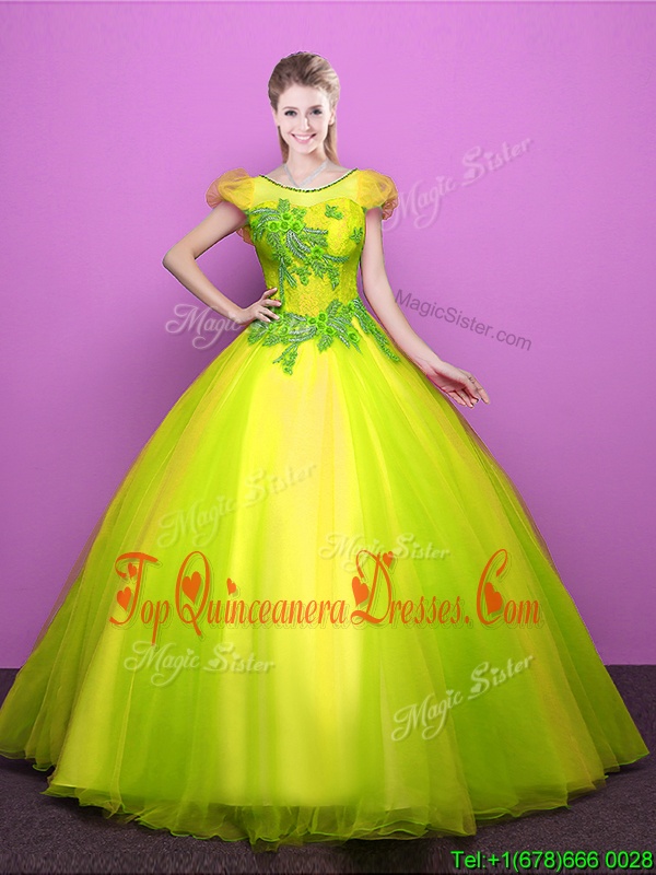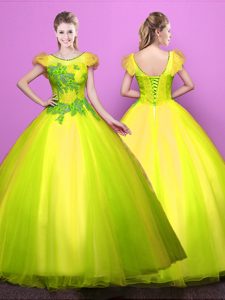 Scoop Short Sleeves Lace Up Vestidos de Quinceanera Yellow Green Tulle