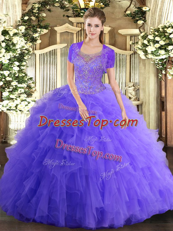 Scoop Sleeveless 15 Quinceanera Dress Floor Length Beading and Ruffled Layers Lavender Tulle