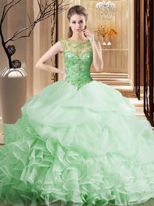 Scoop Sleeveless Beading and Ruffles and Pick Ups Lace Up Dama Dress for Quinceanera with Apple Green Brush Train