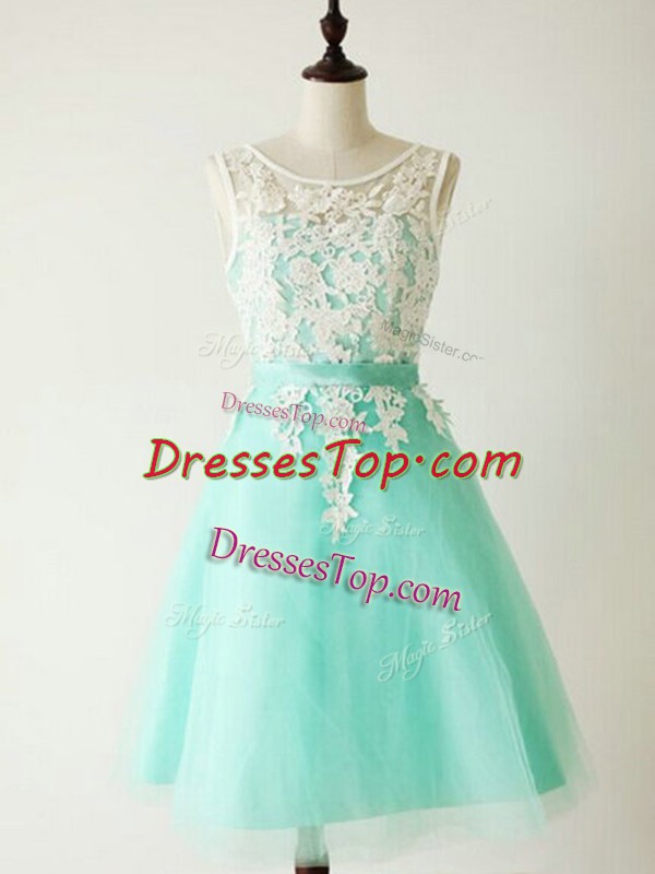 Scoop Sleeveless Court Dresses for Sweet 16 Knee Length Lace Turquoise Tulle