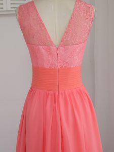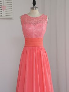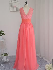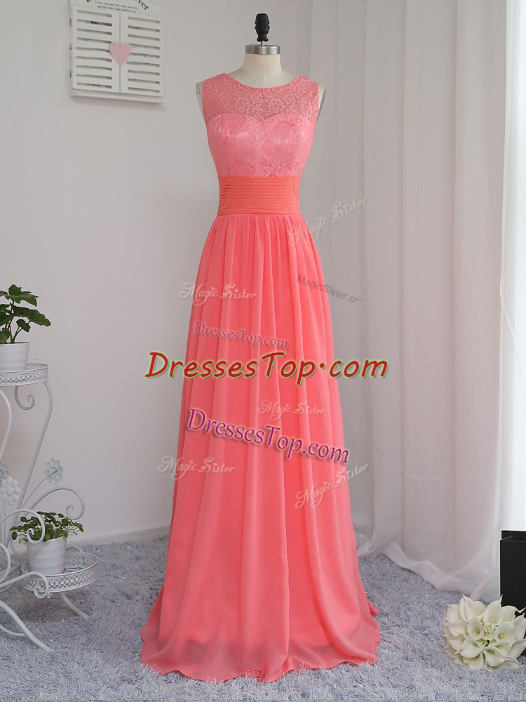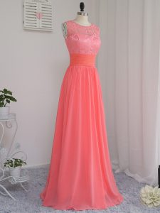 Scoop Sleeveless Damas Dress Floor Length Lace Watermelon Red Chiffon