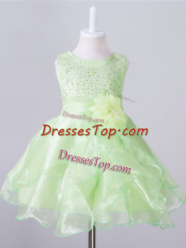 Scoop Sleeveless Kids Formal Wear Knee Length Beading and Hand Made Flower Yellow Green Organza