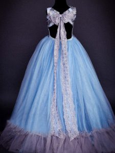 Scoop Sleeveless Little Girls Pageant Dress Floor Length Sequins and Hand Made Flower Light Blue Tulle