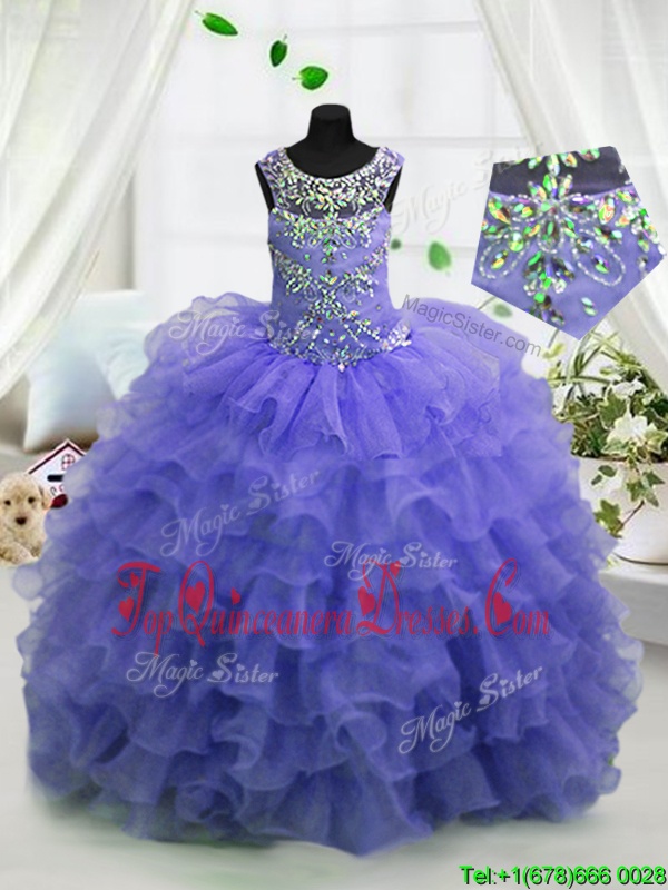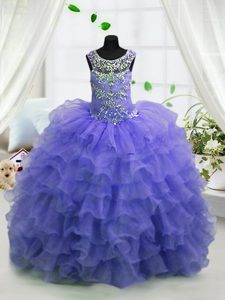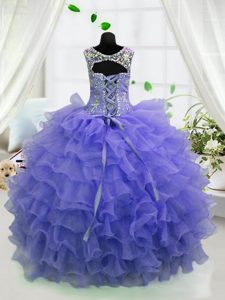 Scoop Sleeveless Organza Floor Length Lace Up Pageant Gowns in Baby Blue for with Beading and Ruffled Layers