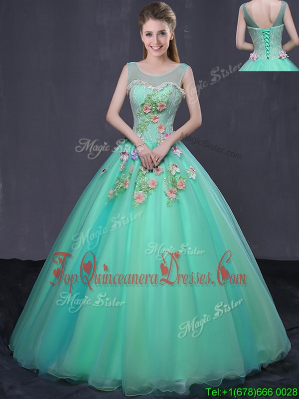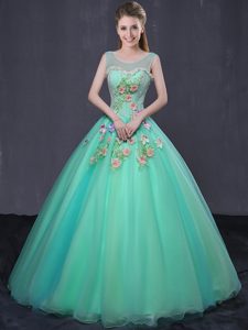 Scoop Sleeveless Organza Floor Length Lace Up Quince Ball Gowns in Turquoise for with Beading and Appliques