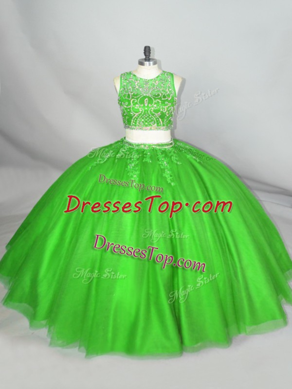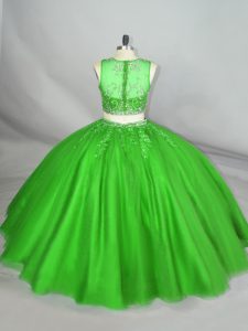 Scoop Sleeveless Quince Ball Gowns Floor Length Beading and Appliques Green Tulle