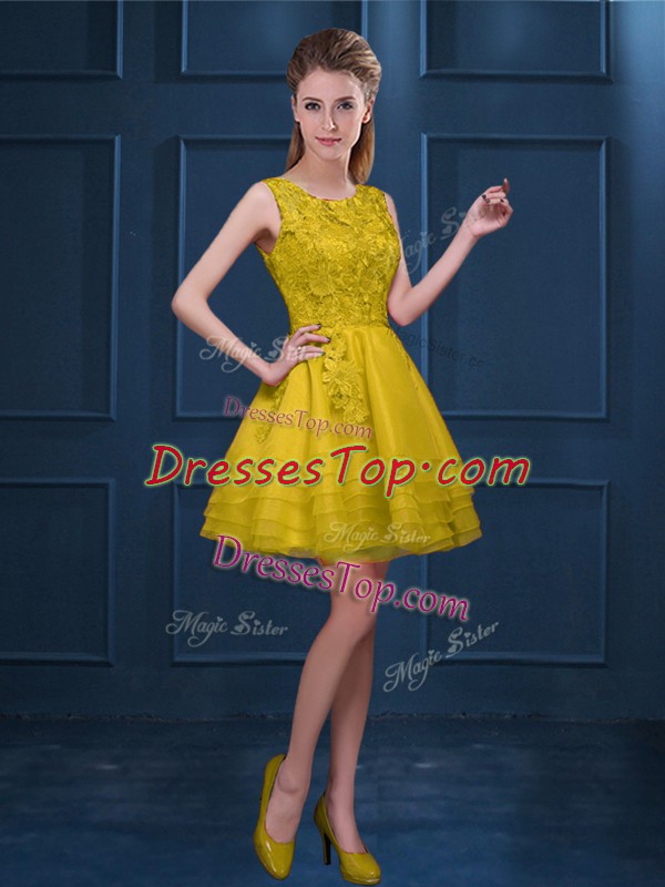 Scoop Sleeveless Quinceanera Court Dresses Knee Length Lace and Ruffled Layers Gold Tulle