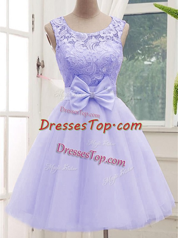 Scoop Sleeveless Quinceanera Dama Dress Knee Length Lace and Bowknot Lavender Tulle