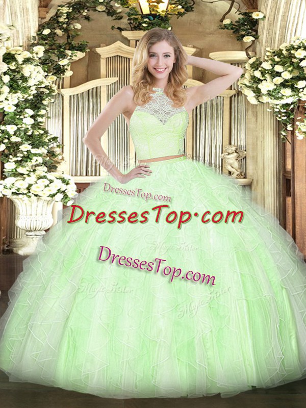 Scoop Sleeveless Quinceanera Dress Floor Length Lace and Ruffles Yellow Green Tulle