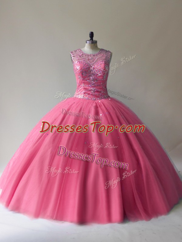 Scoop Sleeveless Quinceanera Gown Floor Length Beading Rose Pink Tulle