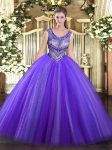 Scoop Sleeveless Tulle Ball Gown Prom Dress Beading Lace Up
