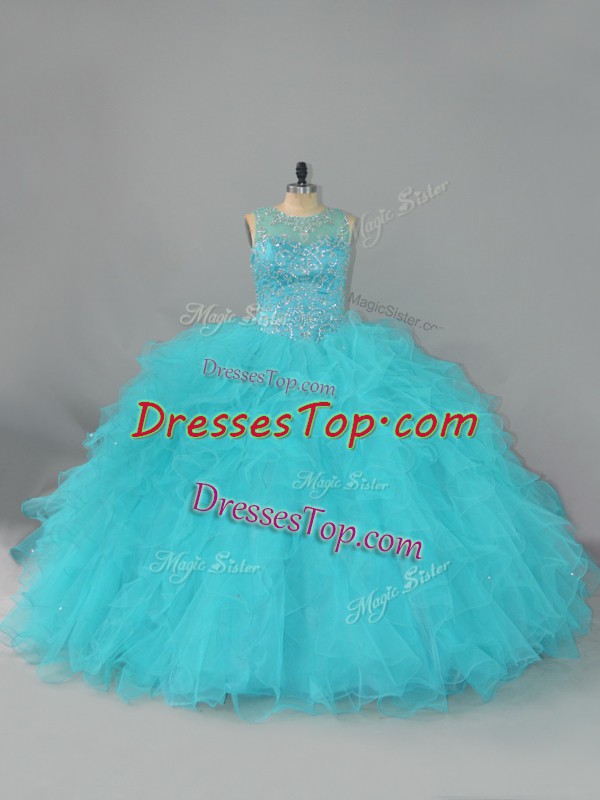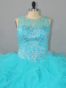 Scoop Sleeveless Vestidos de Quinceanera Floor Length Beading and Ruffles Aqua Blue Tulle