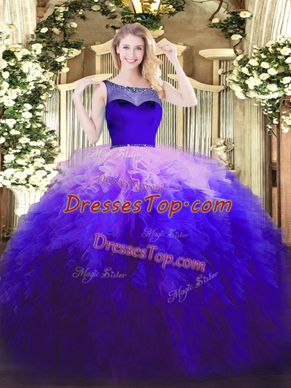 Scoop Sleeveless Vestidos de Quinceanera Floor Length Beading and Ruffles Multi-color Tulle