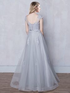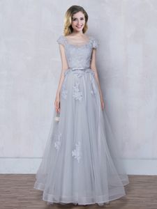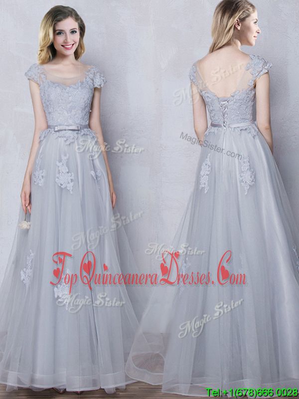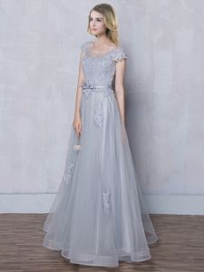 Scoop Tulle Cap Sleeves Floor Length Dama Dress and Lace and Appliques and Belt