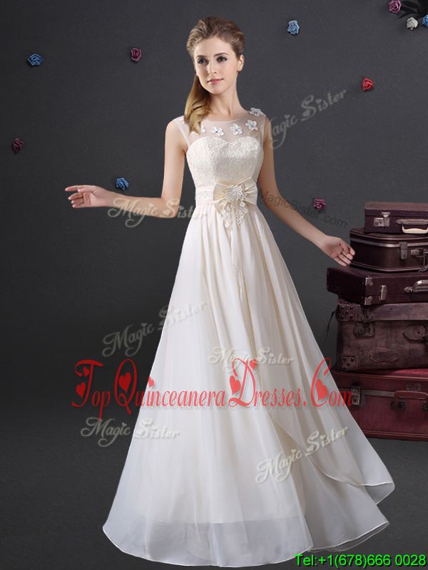 Scoop White Sleeveless Floor Length Lace and Appliques and Bowknot Zipper Court Dresses for Sweet 16