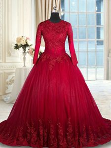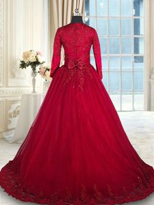 Scoop Wine Red Ball Gowns Beading and Lace and Bowknot 15th Birthday Dress Clasp Handle Tulle Long Sleeves Floor Length