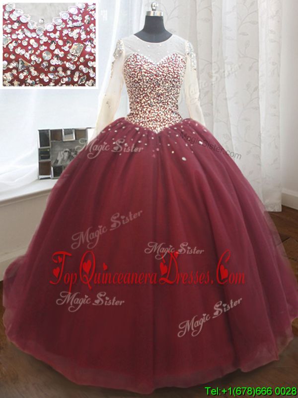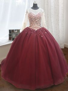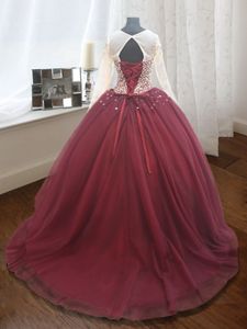 Scoop Wine Red Lace Up 15 Quinceanera Dress Beading and Sequins Long Sleeves Court Train