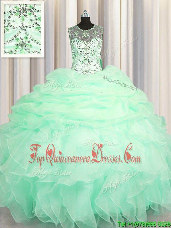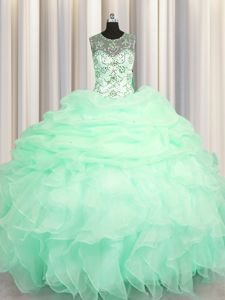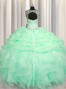 See Through Apple Green Organza Lace Up Scoop Sleeveless Floor Length Quinceanera Gown Beading and Ruffles and Pick Ups